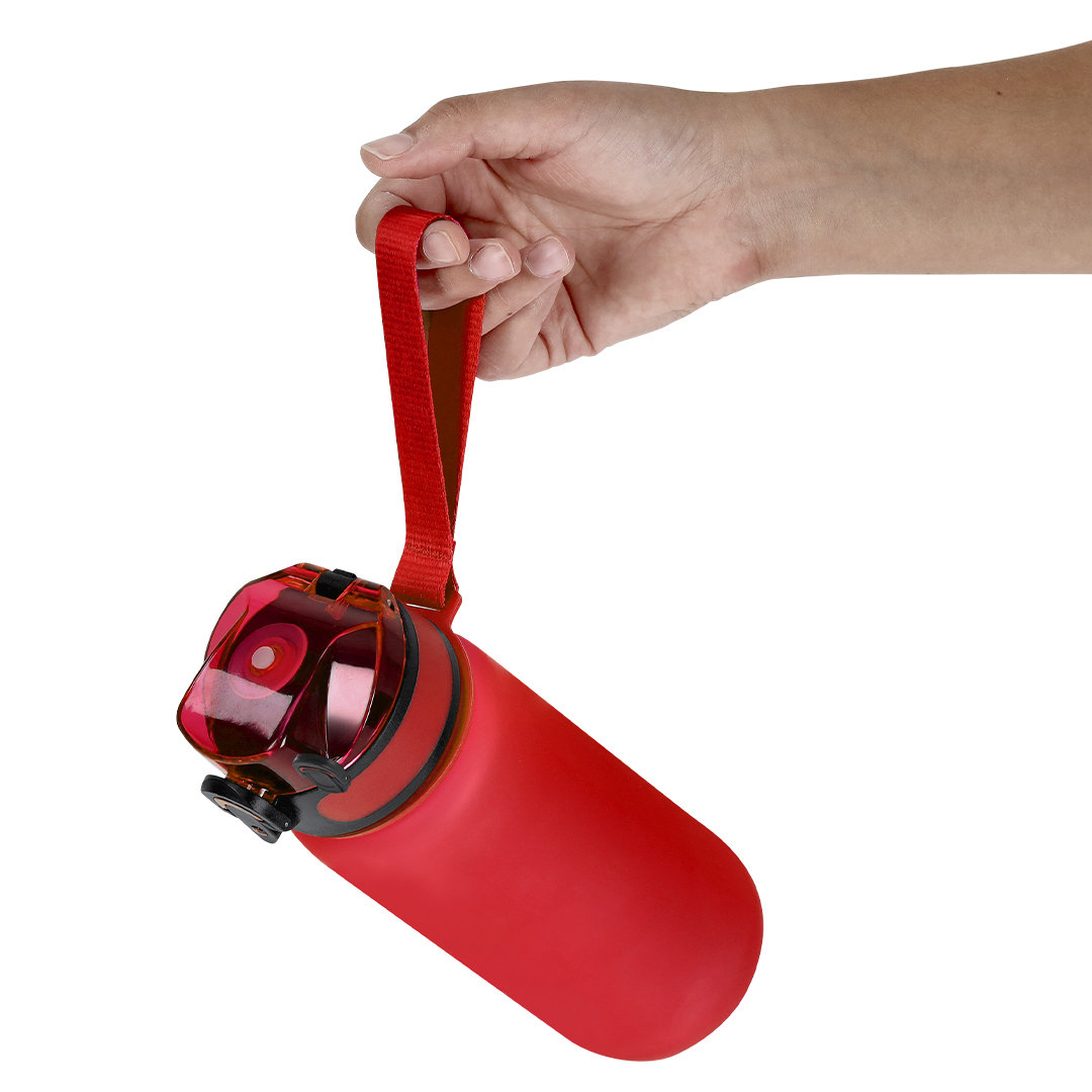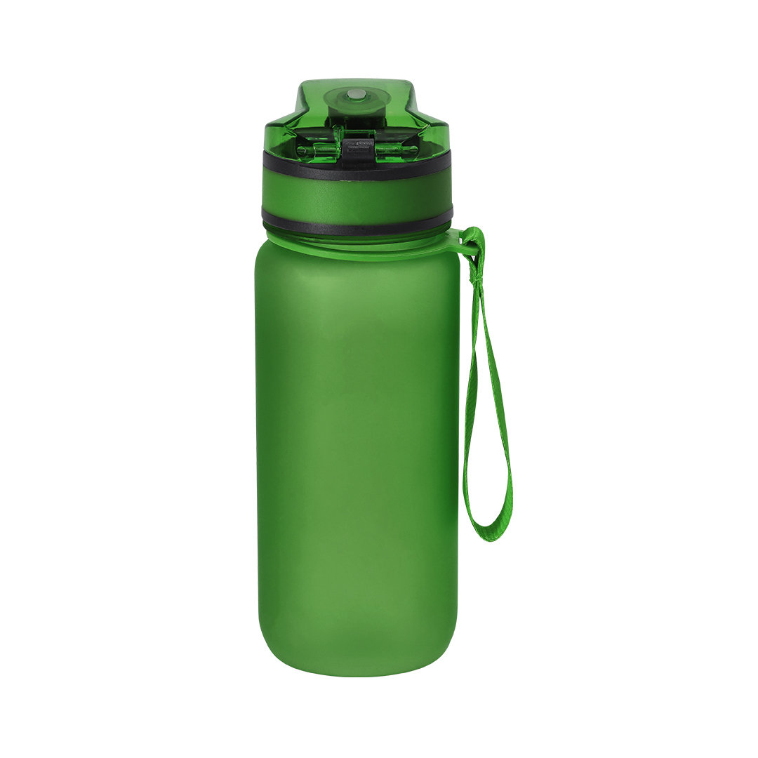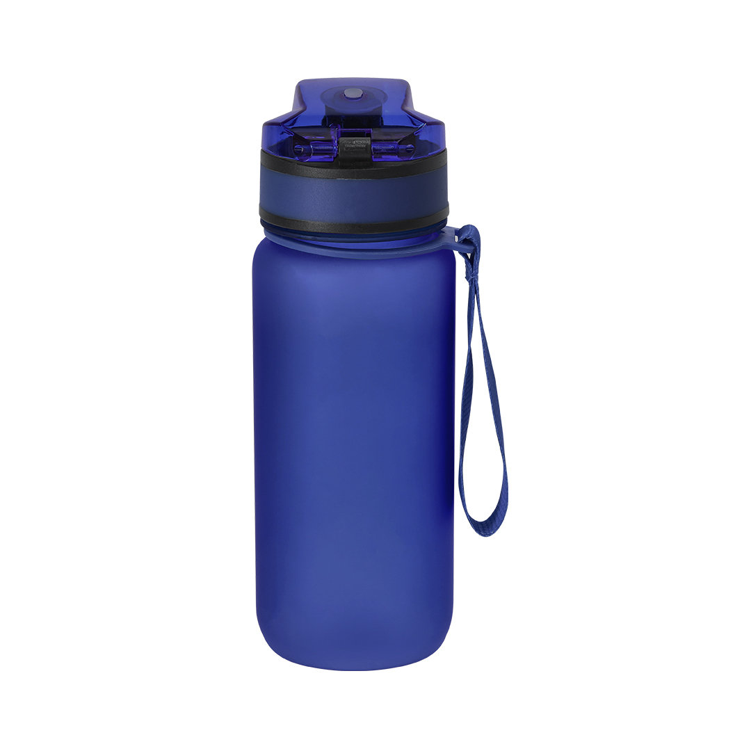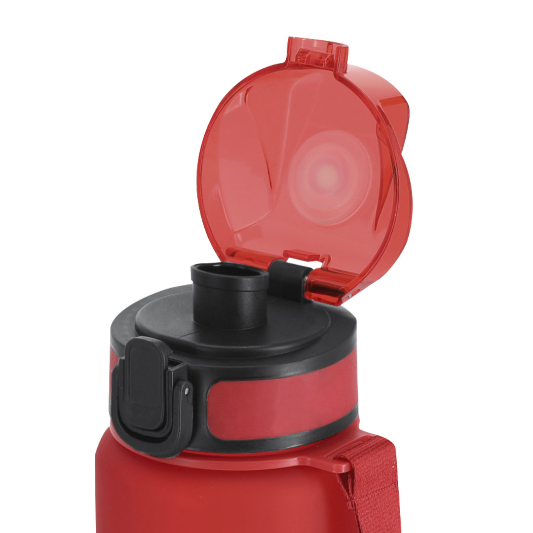 Bidón de 750 ml de capacidad, fabricado en resistente RPET y en acabado translúcido mate. Ingeniosa tapadera con resorte de fácil apertura pulsando el botón frontal, con cierre de seguridad. Sellado óptimo de tapón a rosca y asa para un cómodo transporte en el mismo color. Libre de BPA.