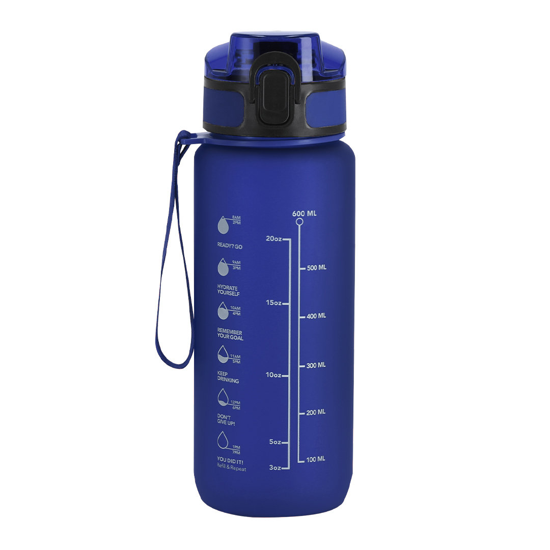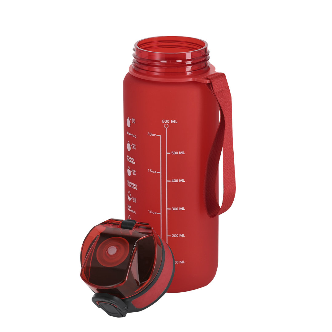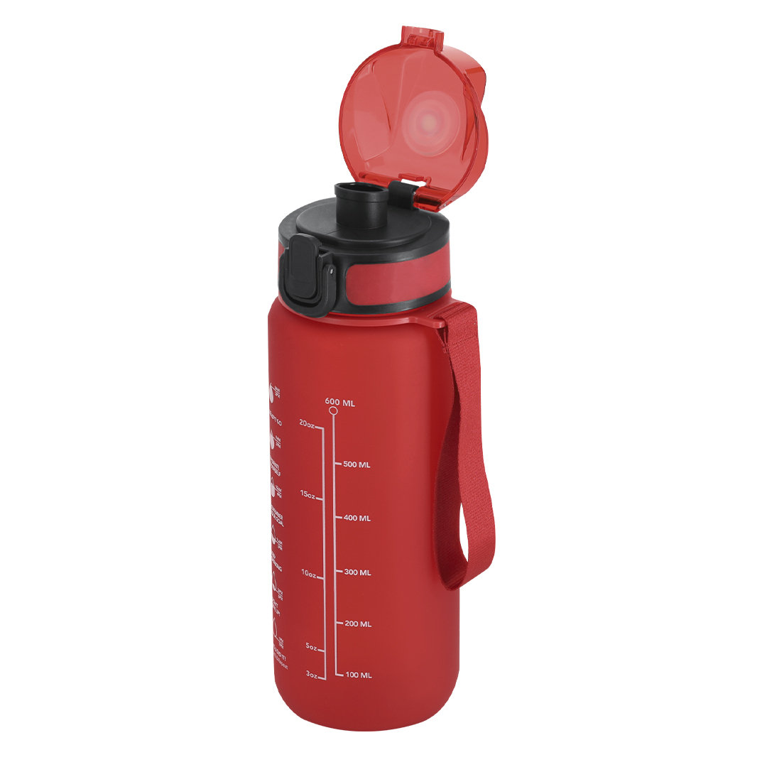 Bidón de 750 ml de capacidad, fabricado en resistente RPET y en acabado translúcido mate. Ingeniosa tapadera con resorte de fácil apertura pulsando el botón frontal, con cierre de seguridad. Sellado óptimo de tapón a rosca y asa para un cómodo transporte en el mismo color. Libre de BPA.