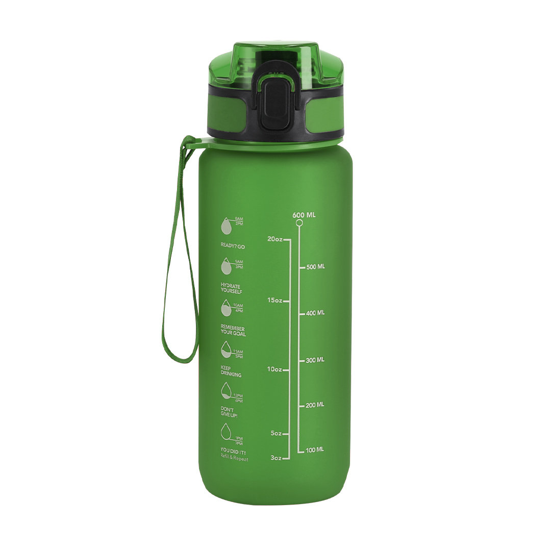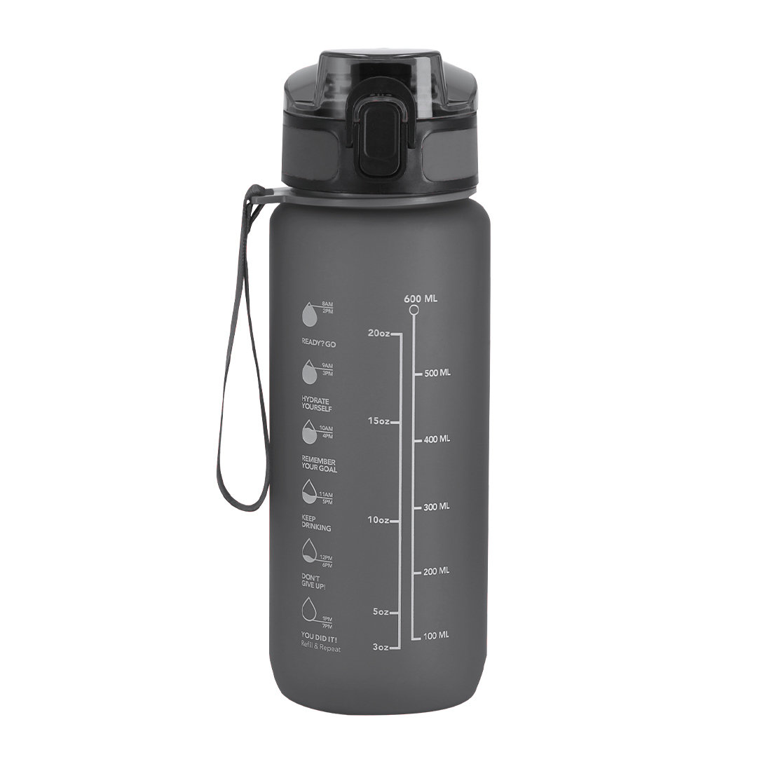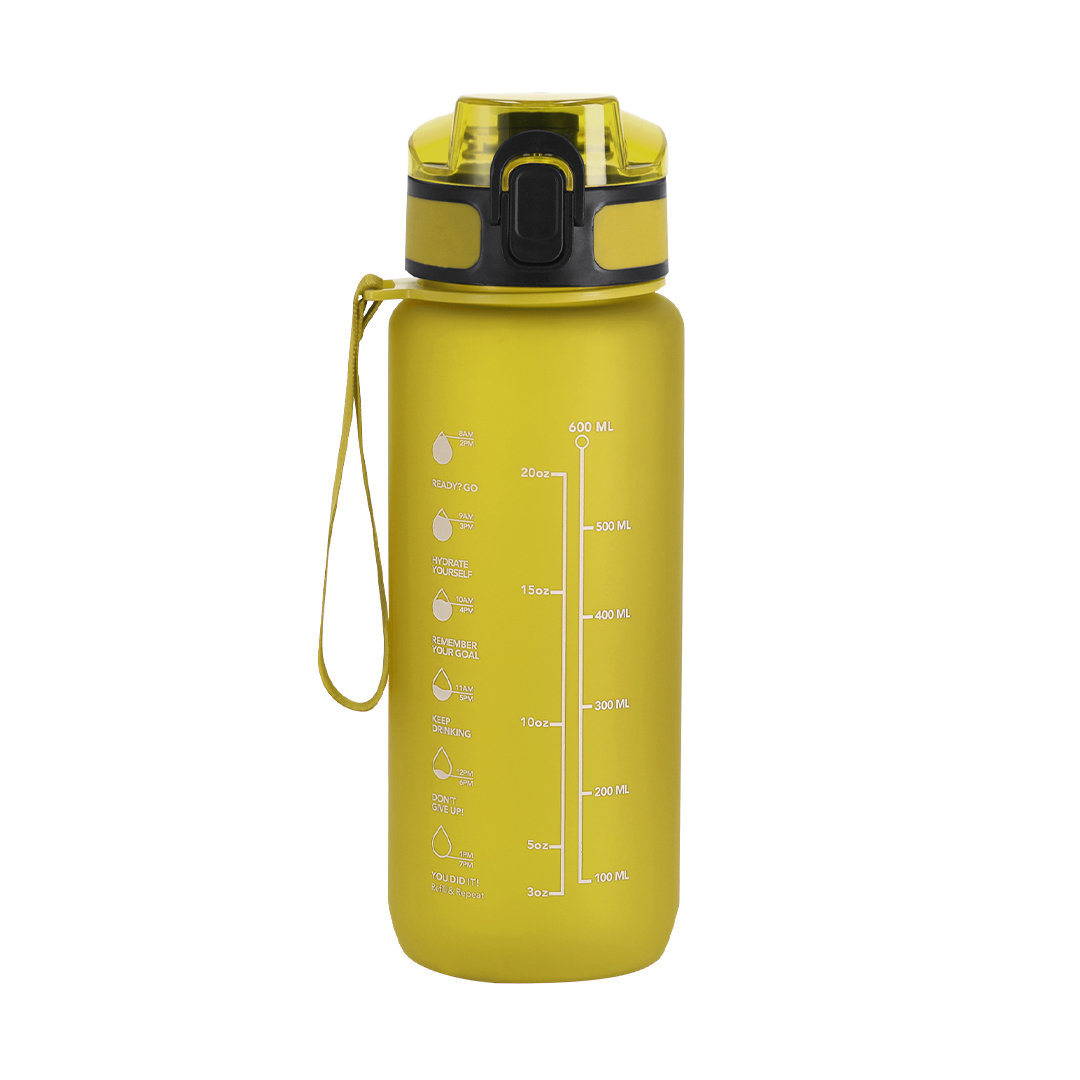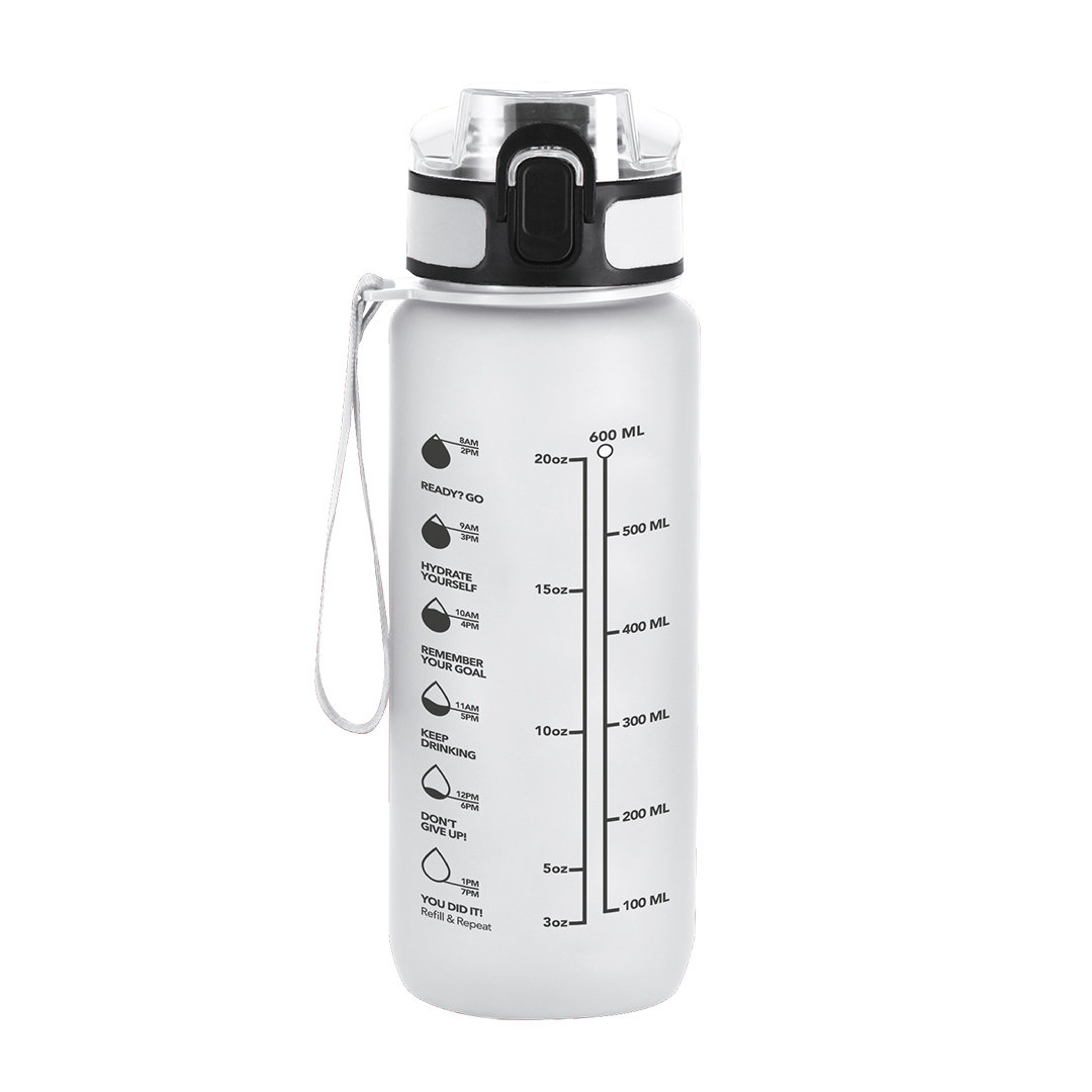 Bidón de 750 ml de capacidad, fabricado en resistente RPET y en acabado translúcido mate. Ingeniosa tapadera con resorte de fácil apertura pulsando el botón frontal, con cierre de seguridad. Sellado óptimo de tapón a rosca y asa para un cómodo transporte en el mismo color. Libre de BPA.