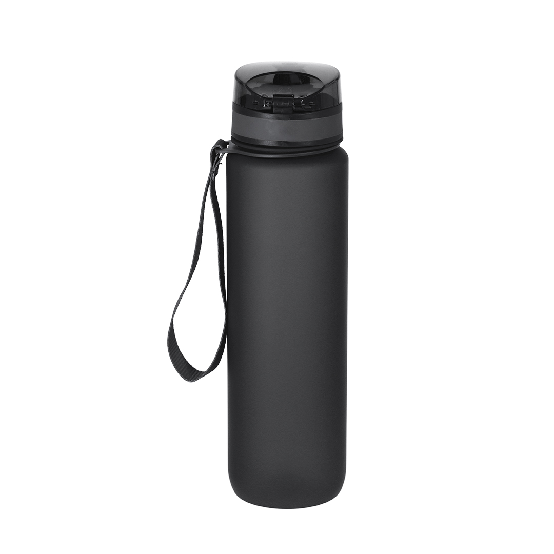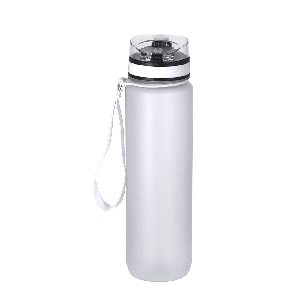 Bidón de 1L de capacidad, fabricado en resistente RPET y en acabado translúcido mate. Con indicador de capacidad en litros y onzas, junto con frases motivadoras que invitan a mantener una adecuada hidratación. Con tapón negro de rosca y tapa con capucha plástica transparente con cierre en push. Con boquilla y cierre de seguridad y cómoda cinta de transporte. Libre de BPA.